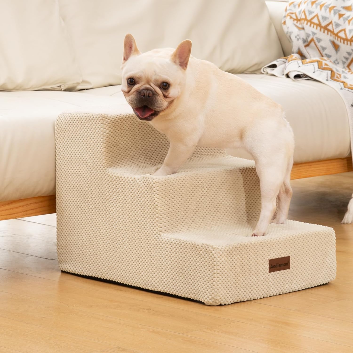 Dog Stairs for Small Dogs & Cats, 3-Step Extra Wide Non-Slip Pet Steps for Couch Sofa and Chair, Beige, 15.7" H
