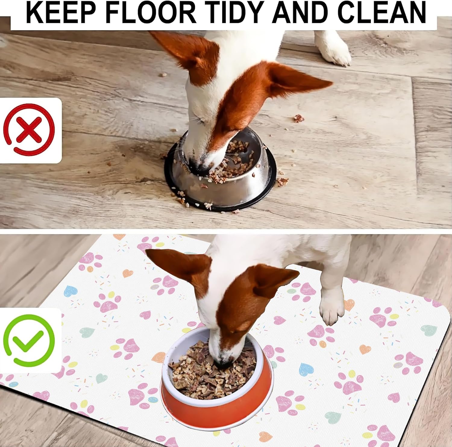 - Super Absorbent & Stain-Resistant:Made with ultra-absorbent fabric, this pet feeding mat quickly soaks up water, milk, or food spills, keeping the area around bowls clean and dry. Say goodbye to wet paw prints and sticky residues—perfect for messy eaters and playful drinkers.