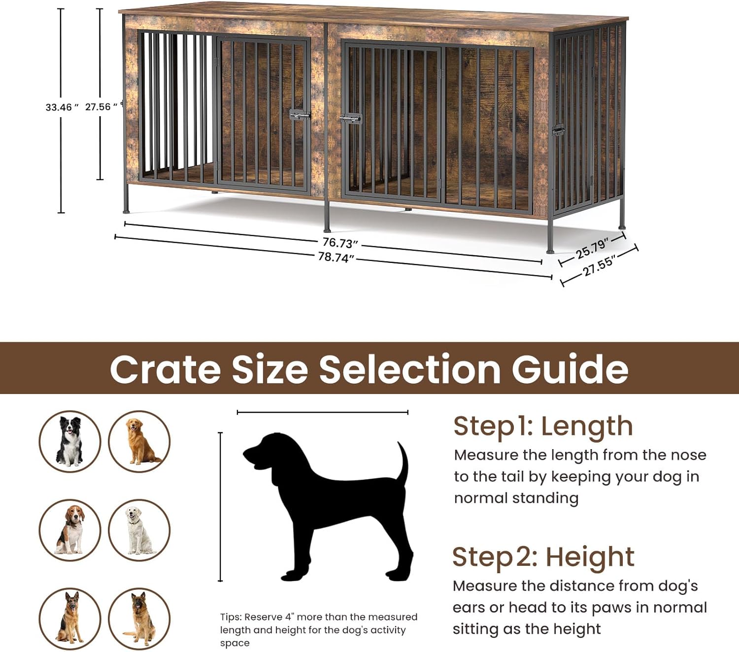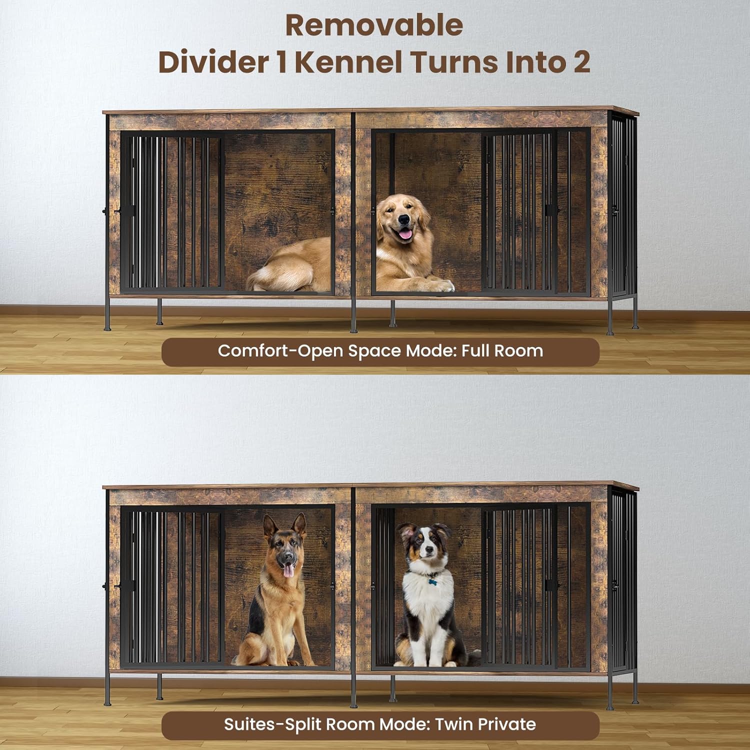 - Room for Two Large Dogs: At 78"L Ă 27.5"W Ă 33"H, this TimberAura dog crate furniture offers two roomy dens so Golden Retrievers or German Shepherds can lie flat and turn comfortably. The built-in center divider creates two separate dens, giving each dog its own space and helping reduce stress during feeding or rest.