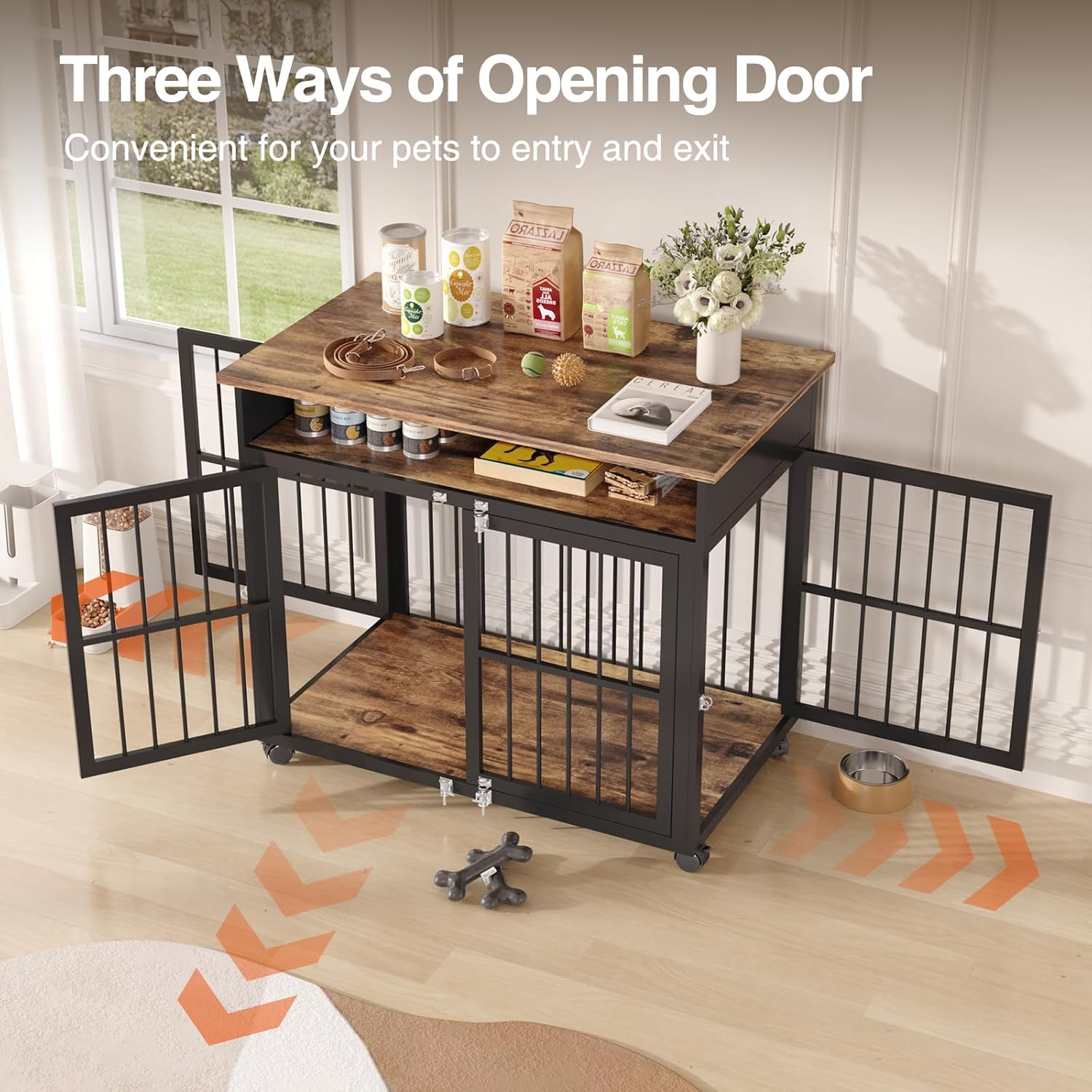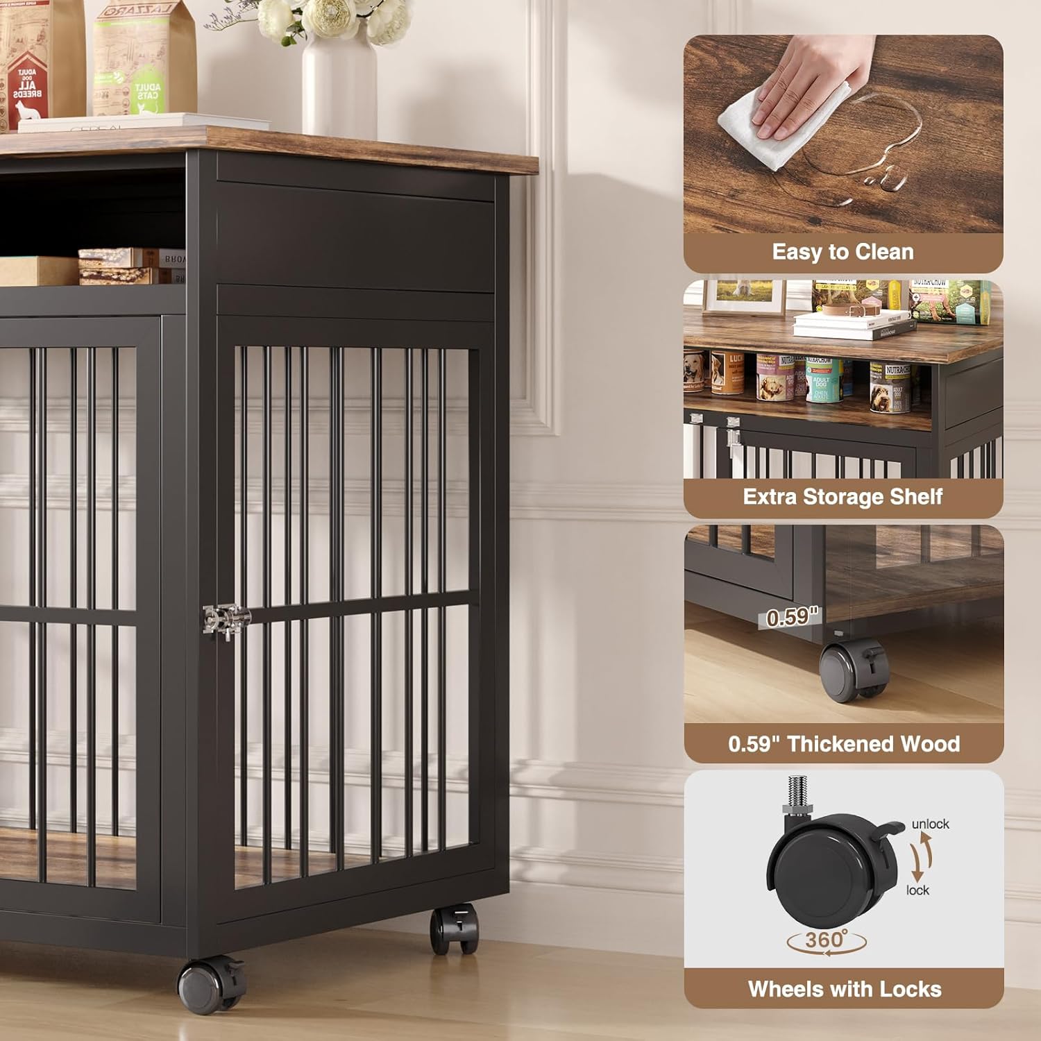 - Furniture-Style Dog KennelďźWith a storage shlef, it serves as both a stylish dog crate and a practical side table. It provides space to store dog supplies and decorate your house at the same time! Equipped with 360° lockable wheels, you can easily move it around your house for different needs.