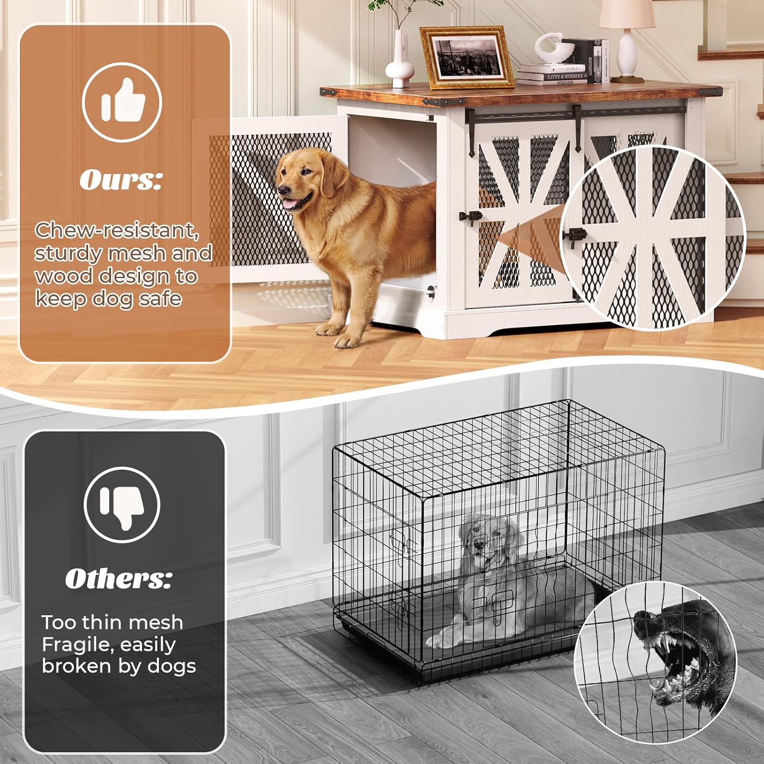 - Chew Resistant: The dog crate furniture is made of thickened steel mesh to keep it safe from dog chewing and bumping, providing your dogs with safety and a long lasting experience