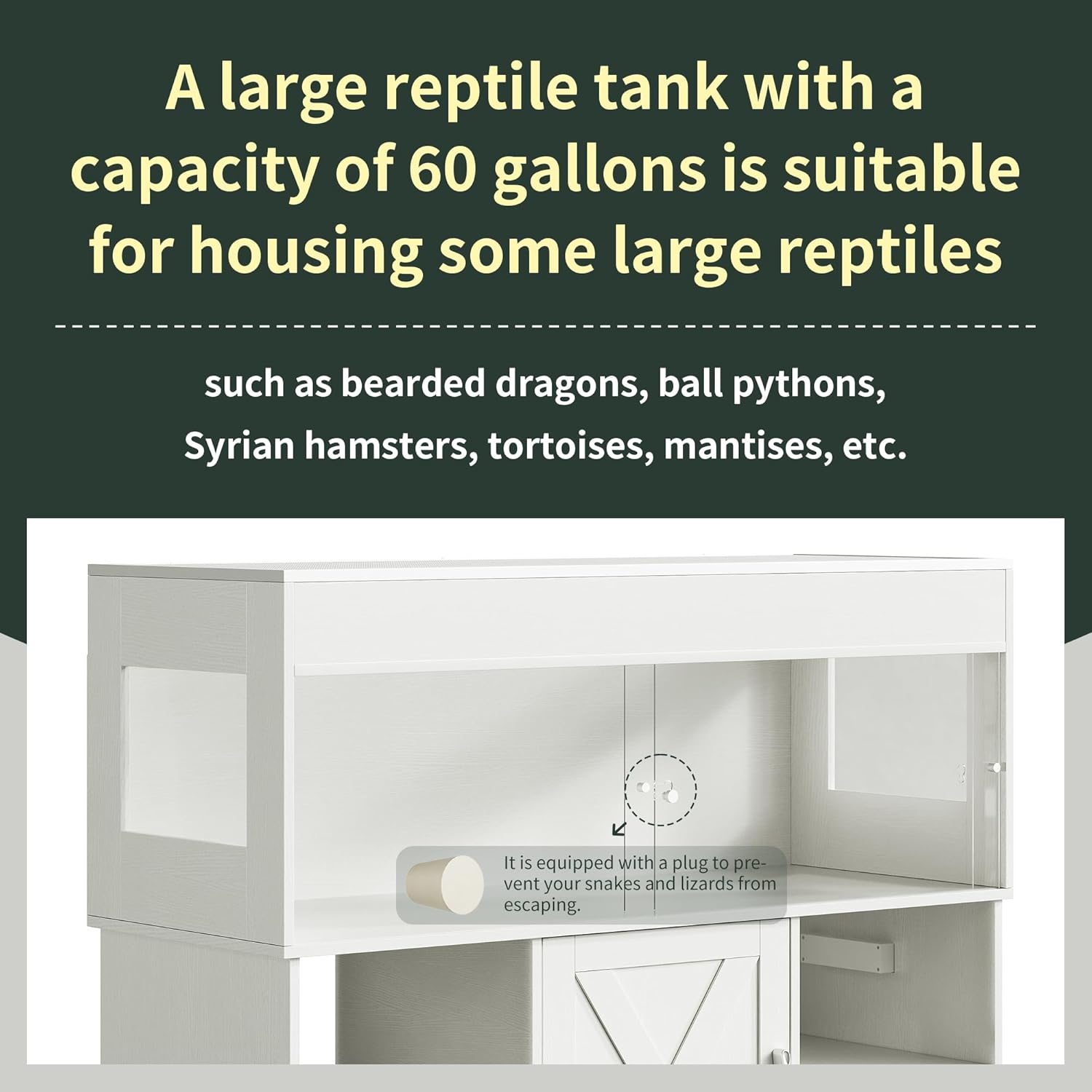 - All-in-One Storage Base â More than just a vivarium tank, this design includes a full base cabinet with dual side compartments and a center door cabinet. Easily store all your reptile care essentialsâUVB lamps, heating mats, thermometers, substrate, snacks, and toolsâin one organized space.