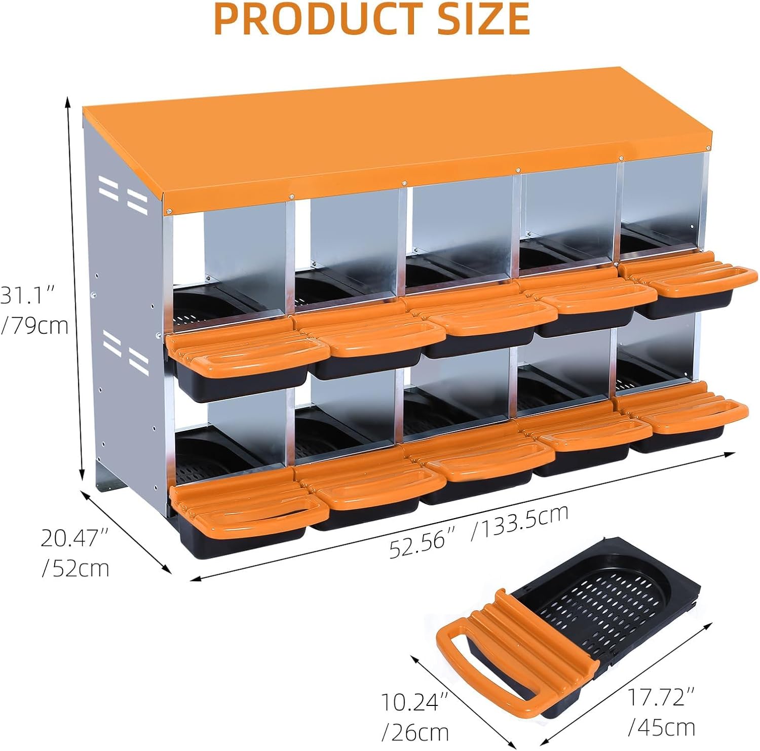 Chicken Nesting Boxes, 10 Hole Metal Chicken Laying Box with with Removable Trays and Roll Out Egg Collection for Chicken Coop, Orange