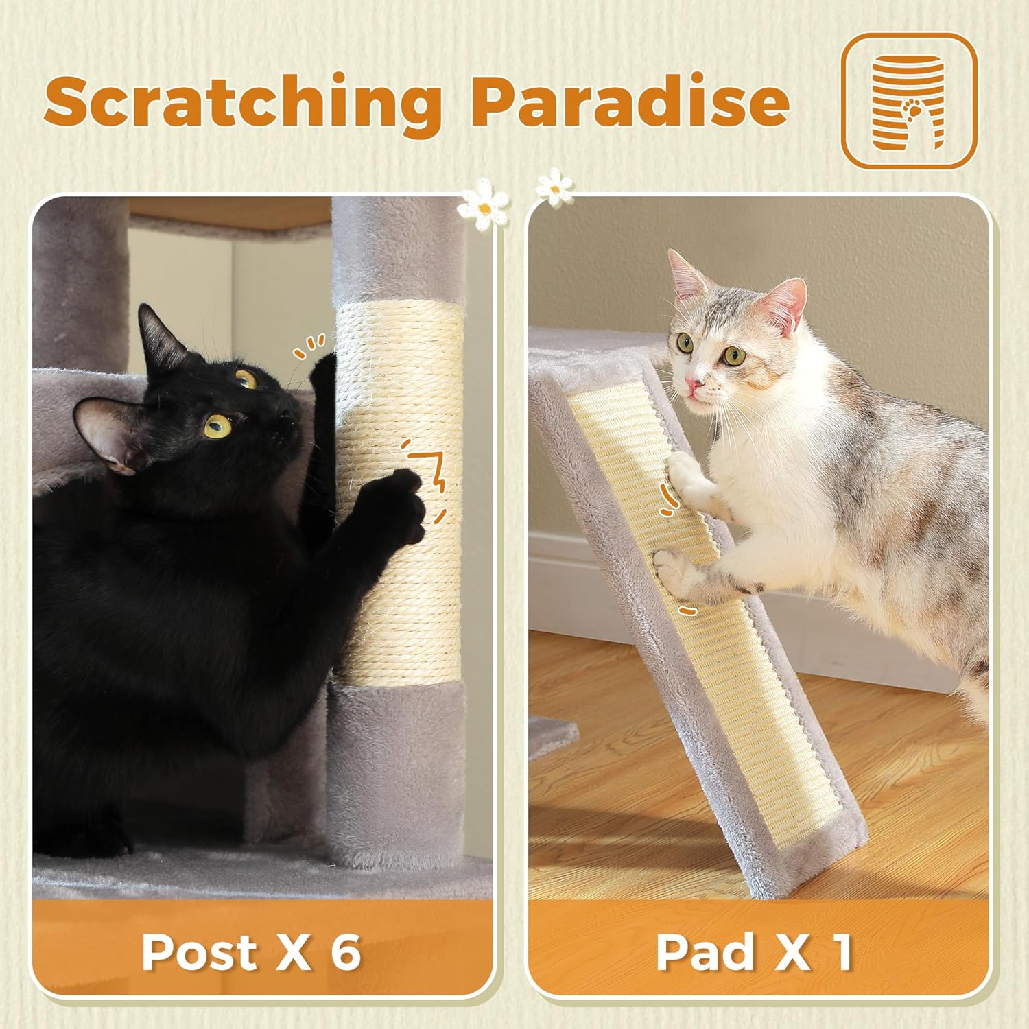 - Ultimate Scratching & Play Center: Designed for large adult cats, this Big cat tree features 6 durable sisal-covered scratching posts, a 2-in-1 scratch pad runway, and 2 dangling toys with 1 bonus replacement ballâperfect for active play and claw care. A cozy round basket hammock and spacious double-door condo offer ideal spots for lounging and napping.