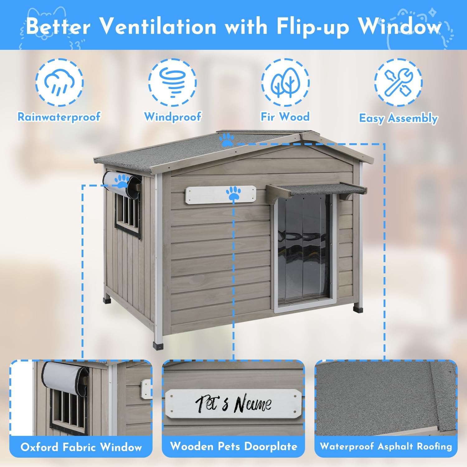 - 【All-Season Comfort】 Our upgraded flip-up window is made from breathable oxford cloth with an easy-to-use hook-and-loop closure. Roll it up for ventilation during hot summer days or close it to keep out cold wind and rain. This weatherproof and insulated outdoor dog house offers reliable year-round protection, ensuring your pup stays cozy and safe in all seasons.
