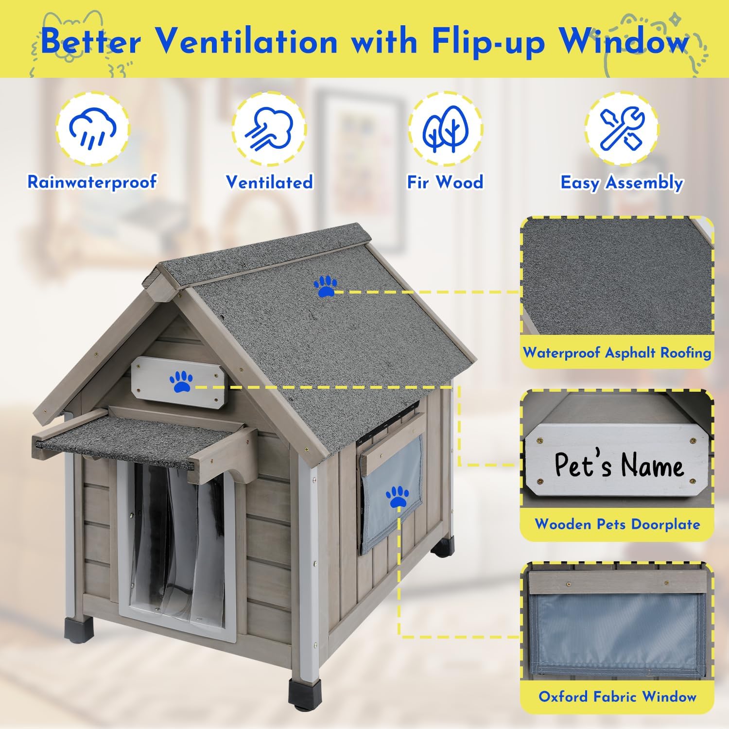 - 【All-Season Comfort】 Our upgraded flip-up window is made from breathable oxford cloth with an easy-to-use hook-and-loop closure. Roll it up for ventilation during hot summer days or close it to keep out cold wind and rain. This weatherproof and insulated outdoor dog house offers reliable year-round protection, ensuring your pup stays cozy and safe in all seasons.
