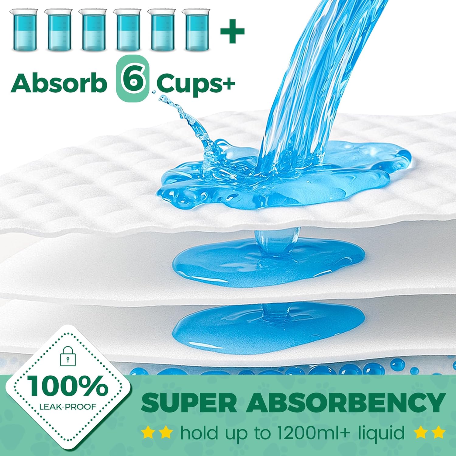 - SUPER ABSORBENT DOG PEE PADS: Extra large pee pads for dogs with super absorbent polymer(SAP) technology are more absorbent than previous dog potty pads, the water absorption capacity of each xlarge puppy pad above 1200+ milliliters (hold up to 6 cups or more of liquid)â keeps paws dry and floors stain-free.