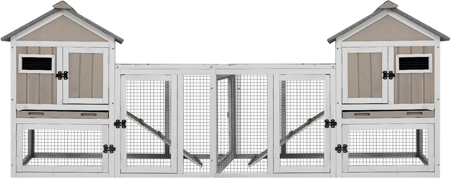 94''L Rabbit Hutch Outdoor Chicken Coop with Run, Wooden Indoor 2 Story Bunny House with Waterproof Roof, Pull Out Tray, Guinea Pig Rabbit Duck Cage for Small to Medium Animals and Pet Lover, Gray