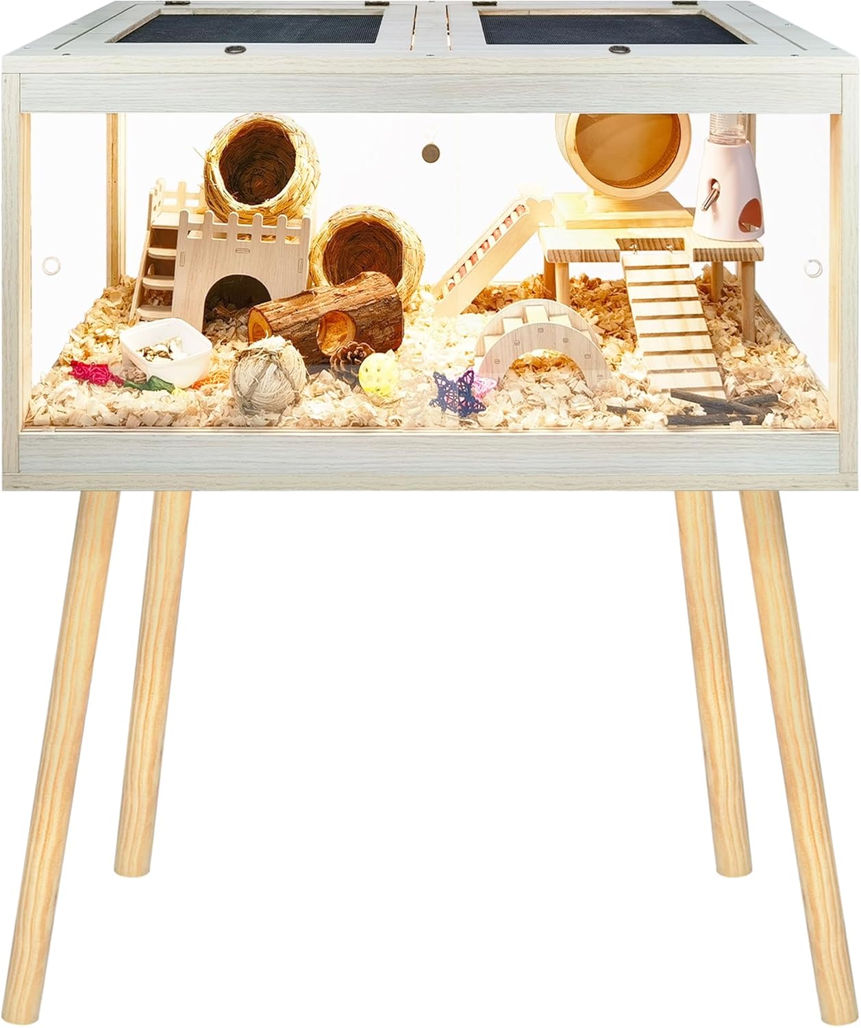 - 【Premium Quality Materials】Available in 4 sizes ranging from 24 to 48 inches in length, with 24 or 27.5 inches legs' height, please refer to picture 2 for size information. Crafted from durable, high-density natural wood treated with a rot-resistant, waterproof coating, our cage ensures longevity and aesthetic appeal. Transparent acrylic panels provide a clear view of your cherished hamsters' activities. An additional acrylic sheet on the cage bottom prevents moisture buildup, simplifying cleaning tasks.