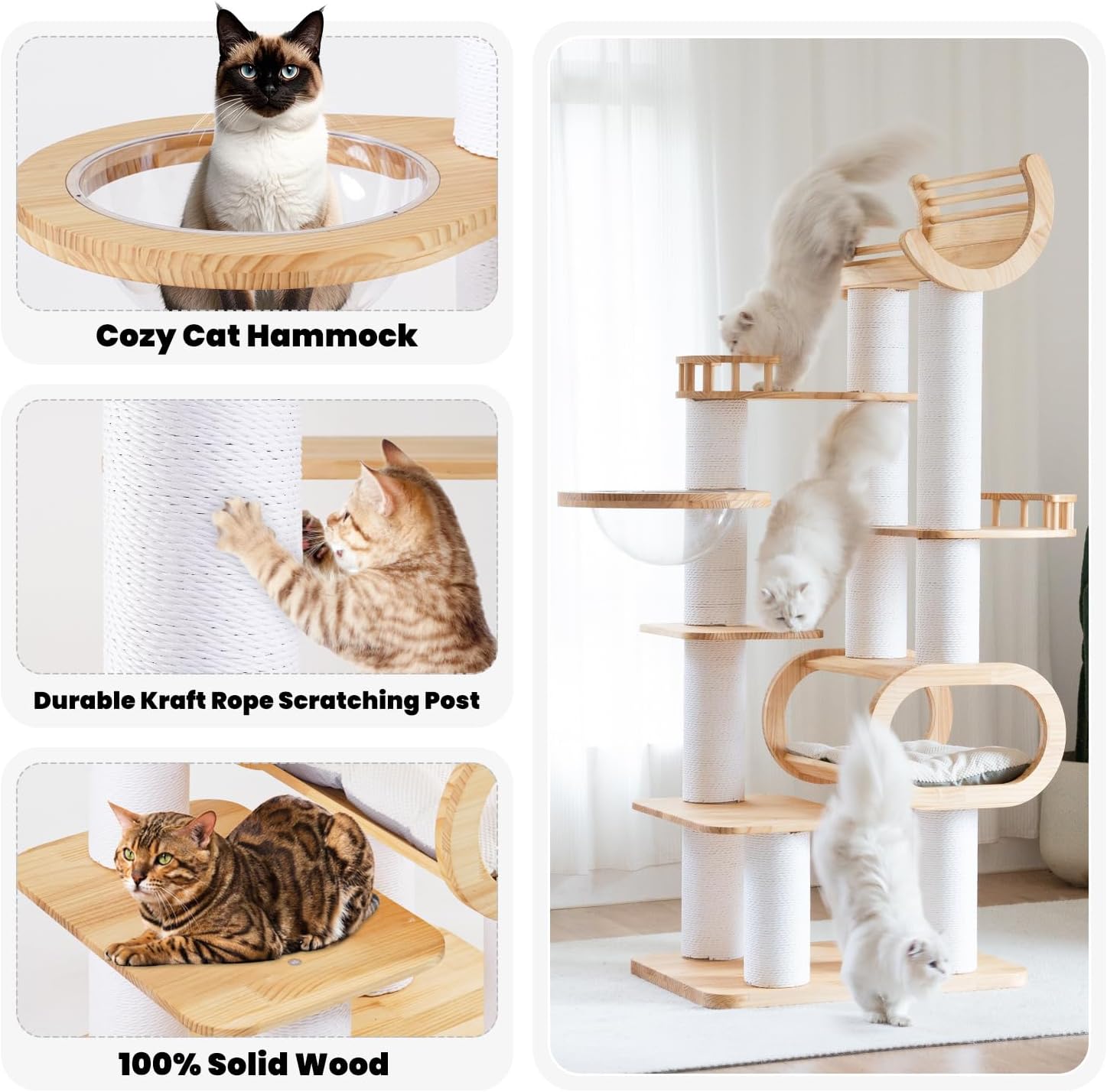 74.8" Modern Cat Tree for Indoor Cats, Tall Wood Cat Tower with Scratching Post, Heavy Duty Luxury Condo with Removable Mats, Multi-Level Cat Furniture for Cats