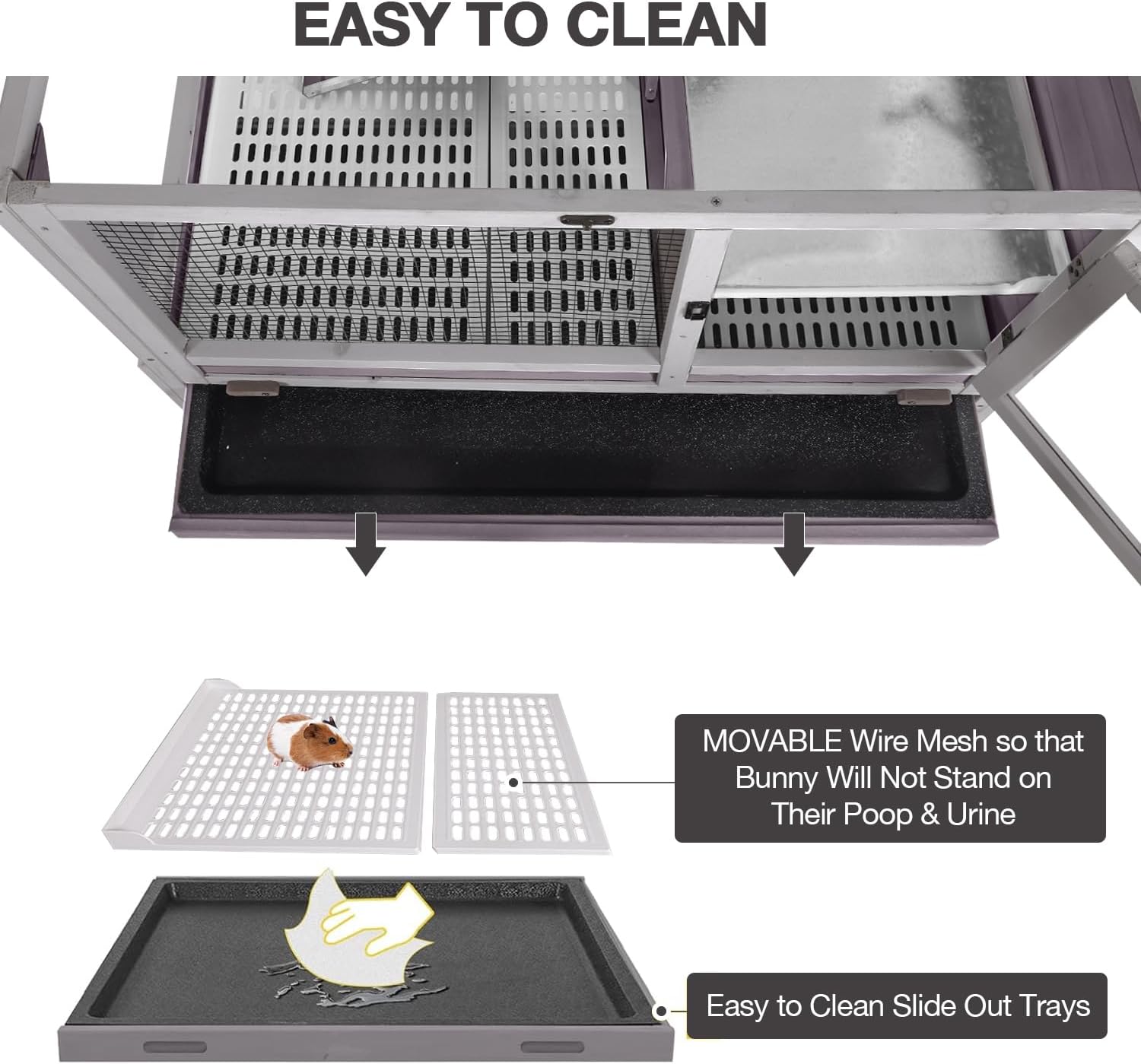 - EASY CLEAN WITH BOTTOM TRAY Our rabbit cage is equipped with a detachable leak-proof tray that can be easily pulled out to clean feces or bedding. There is a metal mesh to prevent rabbits from stepping on excrement. It is equipped with two wooden locks at the same time to prevent the pallet from sliding.Give your furry friend a clean and comfortable home
