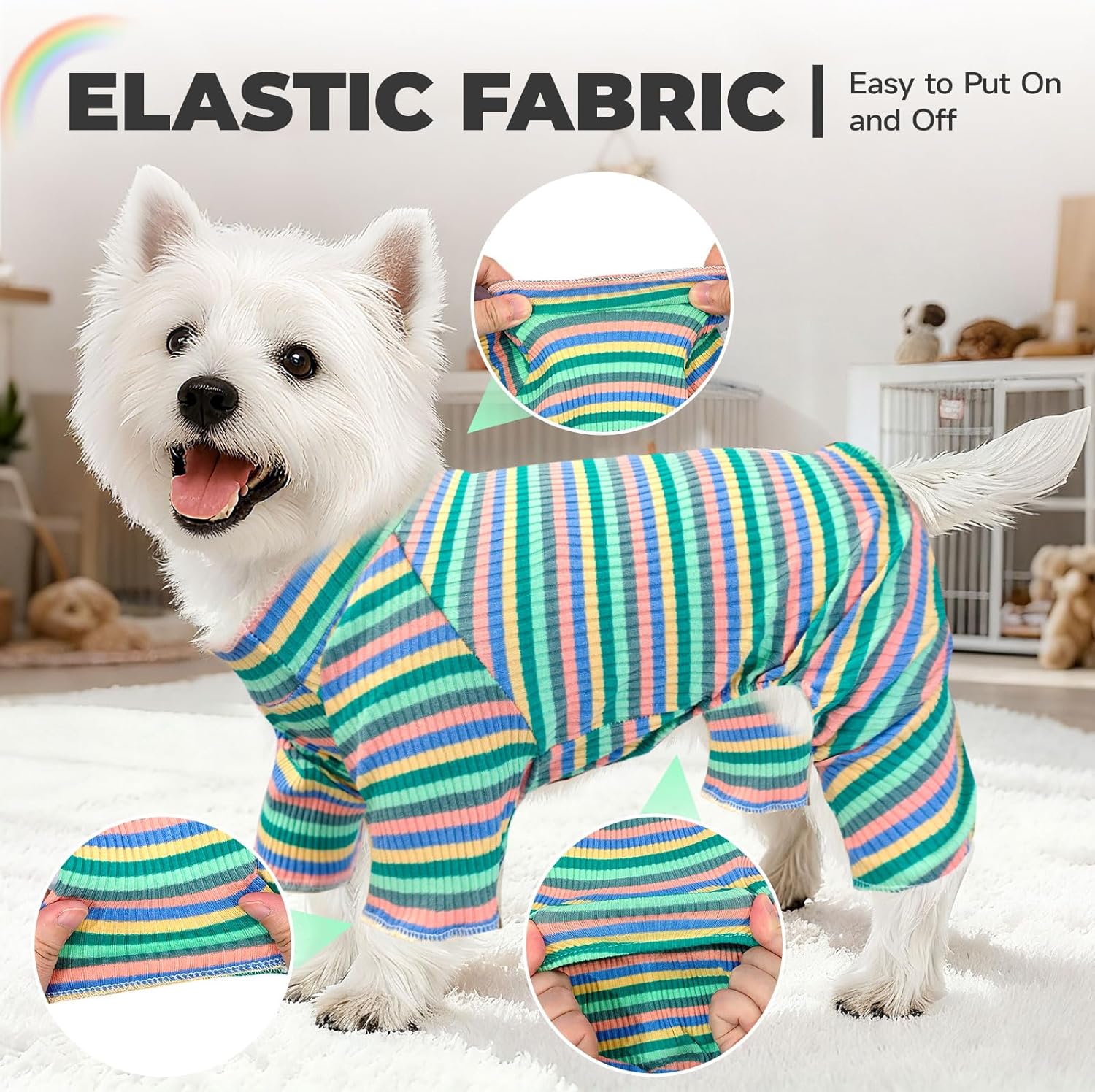 - SUPER-STRETCHY & EASY PUT ON/OFF:These dog pajamas feature exceptional stretchability throughout the entire garment, including the neckline, cuffs, leg openings, and waist area. The stretchy neckline expands comfortably for easy head placement, while the flexible cuffs and leg openings allow paws to slide through smoothly. The elastic waist ensures a secure yet comfortable fit that moves naturally with your dogâs body. This thoughtful stretch design makes dressing stress-free and quick, turning what can often be a struggle into a seamless experience for both you and your pet