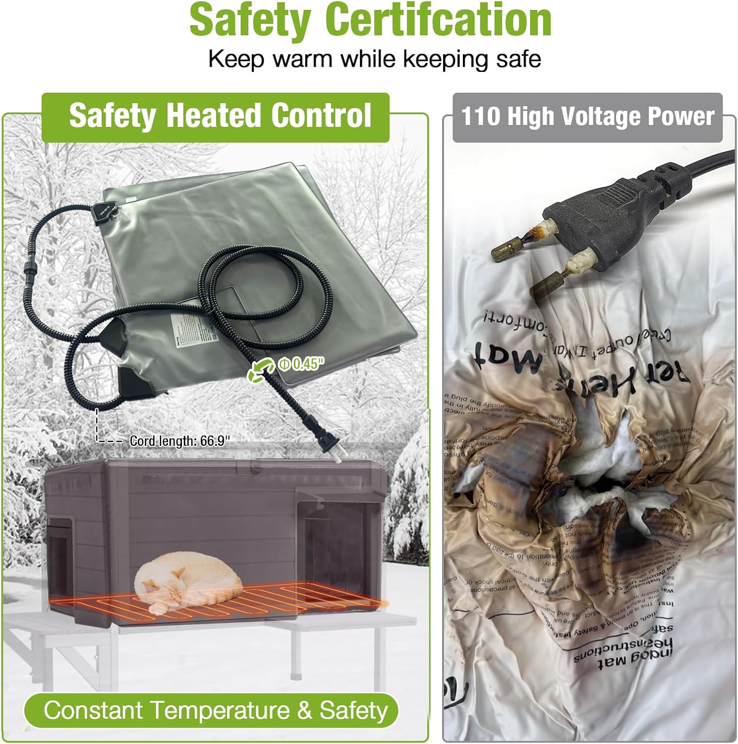 - SAFE HEATING SYSTEM: Equipped with a UL-tested heating pad (automatic temperature control: 89–116°F) and a built-in high-temperature protection device, the heated cat house prevents overheating or chilling. A 6.5 ft chew-resistant cord adds extra safety