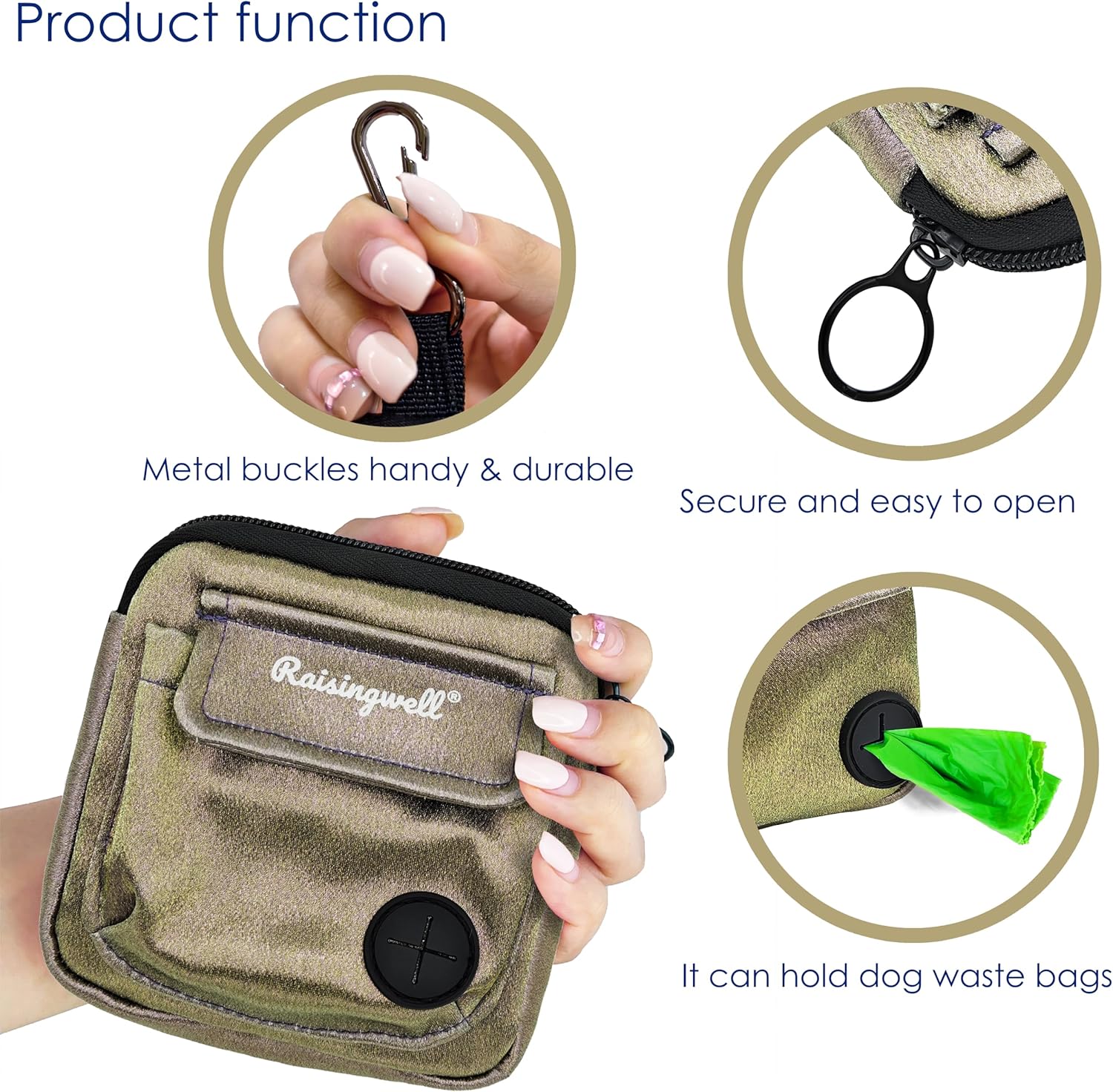 - 3ăDurable Tech Material: Raisingwell's dog treat training pouchis made from durable, washable, and non-toxic fabric. Notably, its waterproof lining solves the problem of difficult-to-clean interiors of training bags.