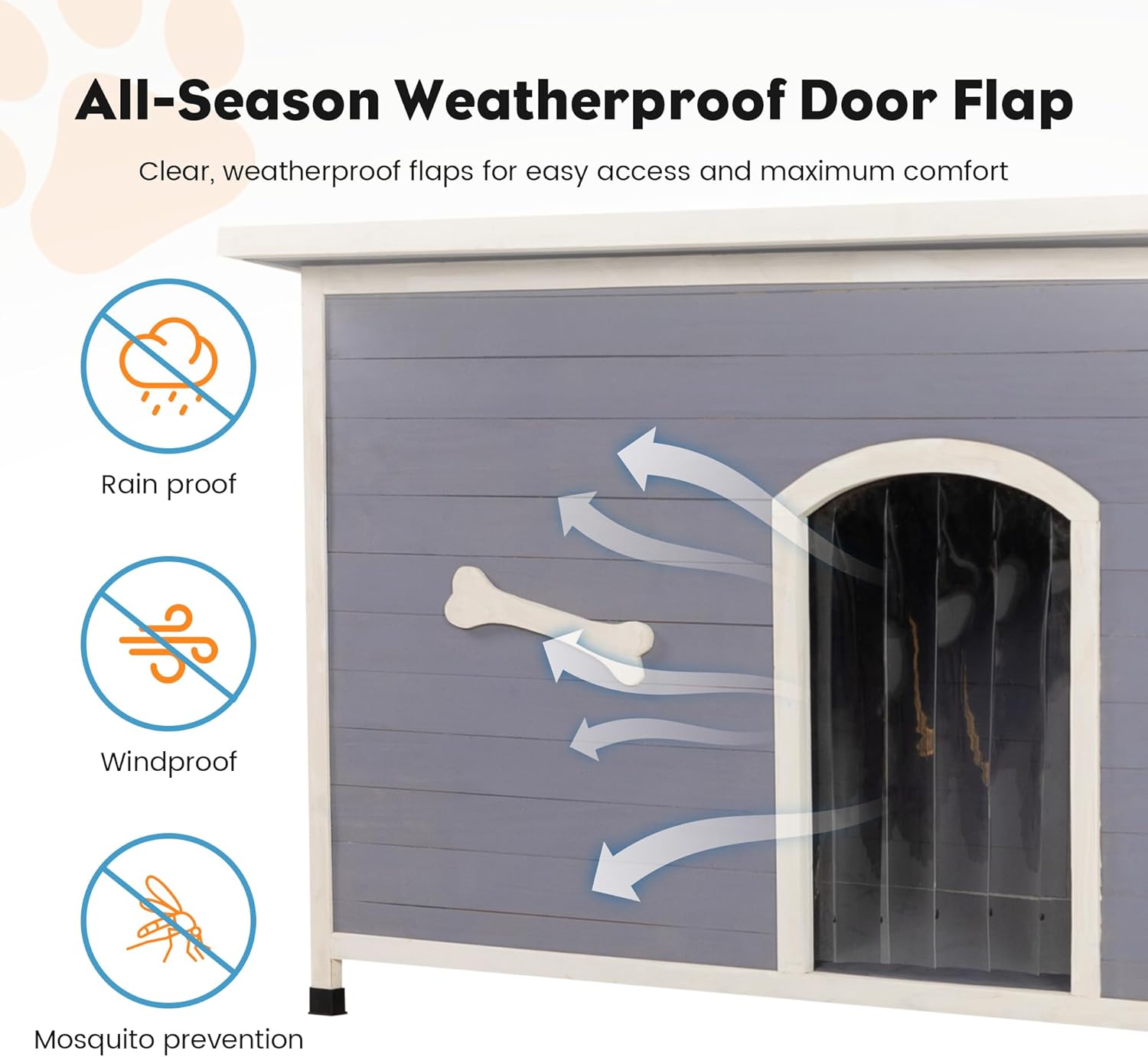 - [Specially Designed for Outdoor Use] The sloping asphalt roof is expertly engineered to prevent rainwater from pooling, ensuring that your pet's living space remains dry and comfortable. The floor is 2.4ââ above the ground, and there is a removable PVC curtain and adaptable floor pads for uneven ground. This design enables the dog house to withstand harsh weather conditions, preventing water from seeping in and materials from getting damp